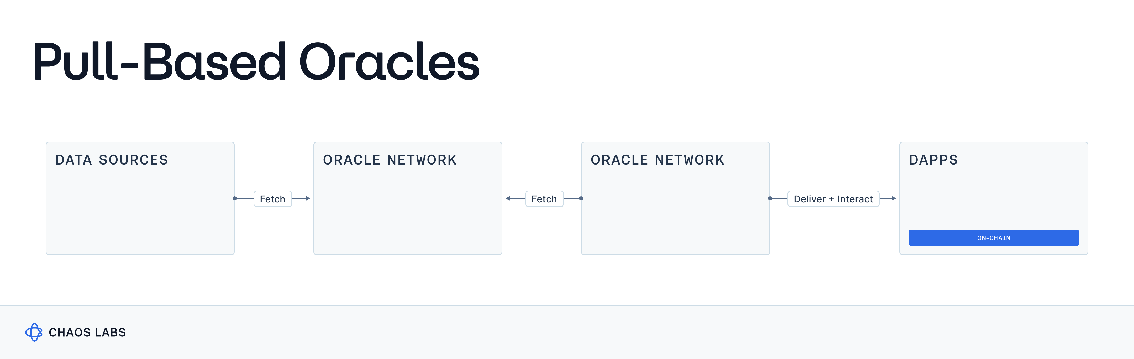 Initiated by Chronicle and popularized by Chainlink, off-chain, push-based oracles represent the dominant Oracle in DeFi today. These oracles deliver fresh data based on predetermined, discrete parameters: a time-based trigger (aka “the heartbeat”) and a volatility/price action trigger. Chainlink’s push-based oracles inherit a volume-weighted average price (VWAP) methodology from data sources that also employ outlier detection mechanisms.