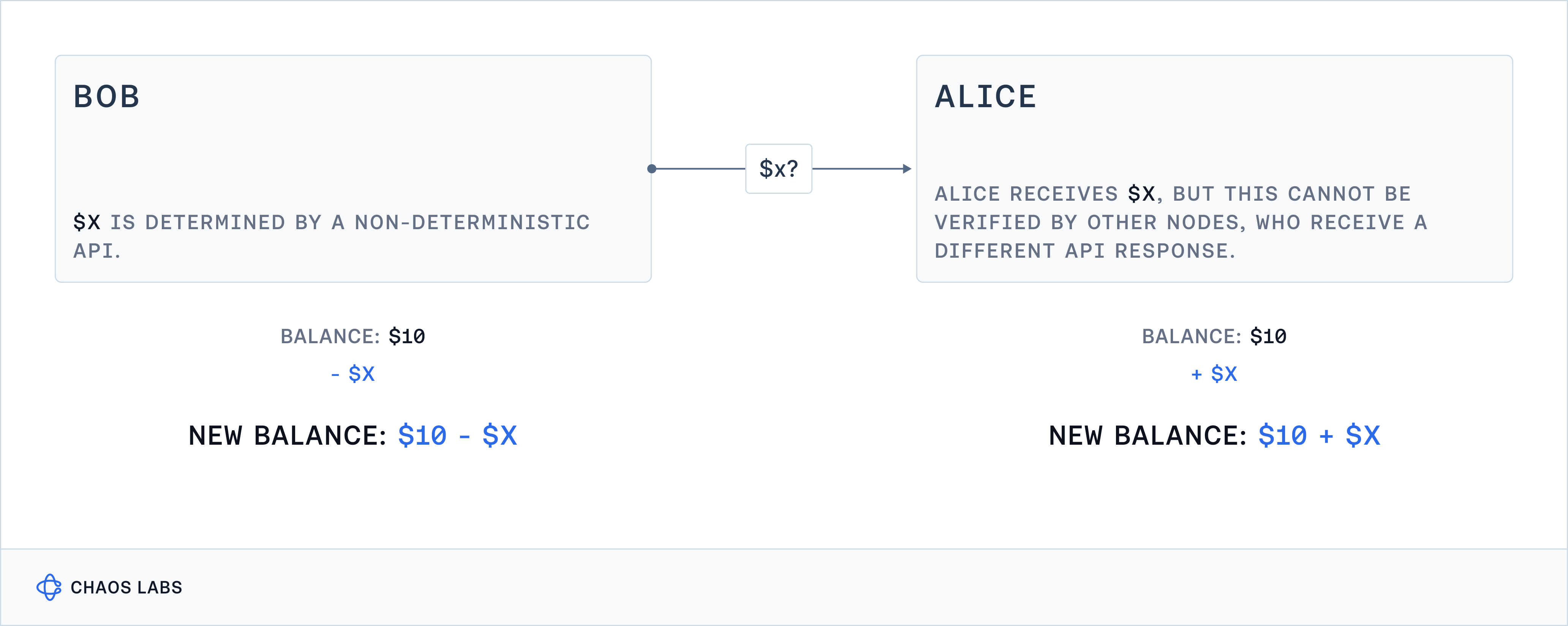 However, determinism faces challenges when external APIs are employed to validate transactions. Consider a scenario where Bob’s transfer to Alice’s contract relies on an API to determine the amount to transfer based on the price of ETH.