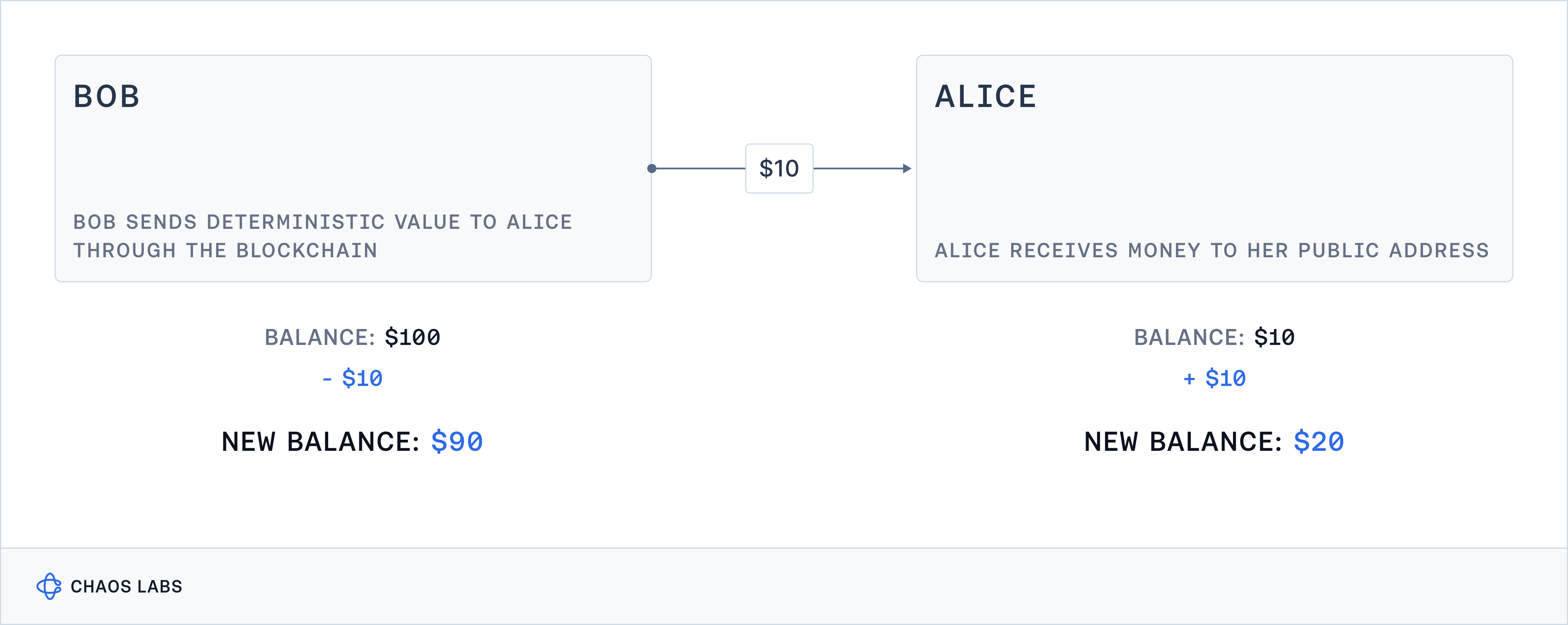 The blockchain's distributed ledger nature mandates that each node in the network reaches a deterministic output given identical input, enabling consensus among nodes during transaction validation. For example, in a transaction where $10 is transferred from Bob to Alice, each node independently adjusts Alice's balance by adding $10 and deducting the same amount from Bob's account, ensuring uniformity across the network.