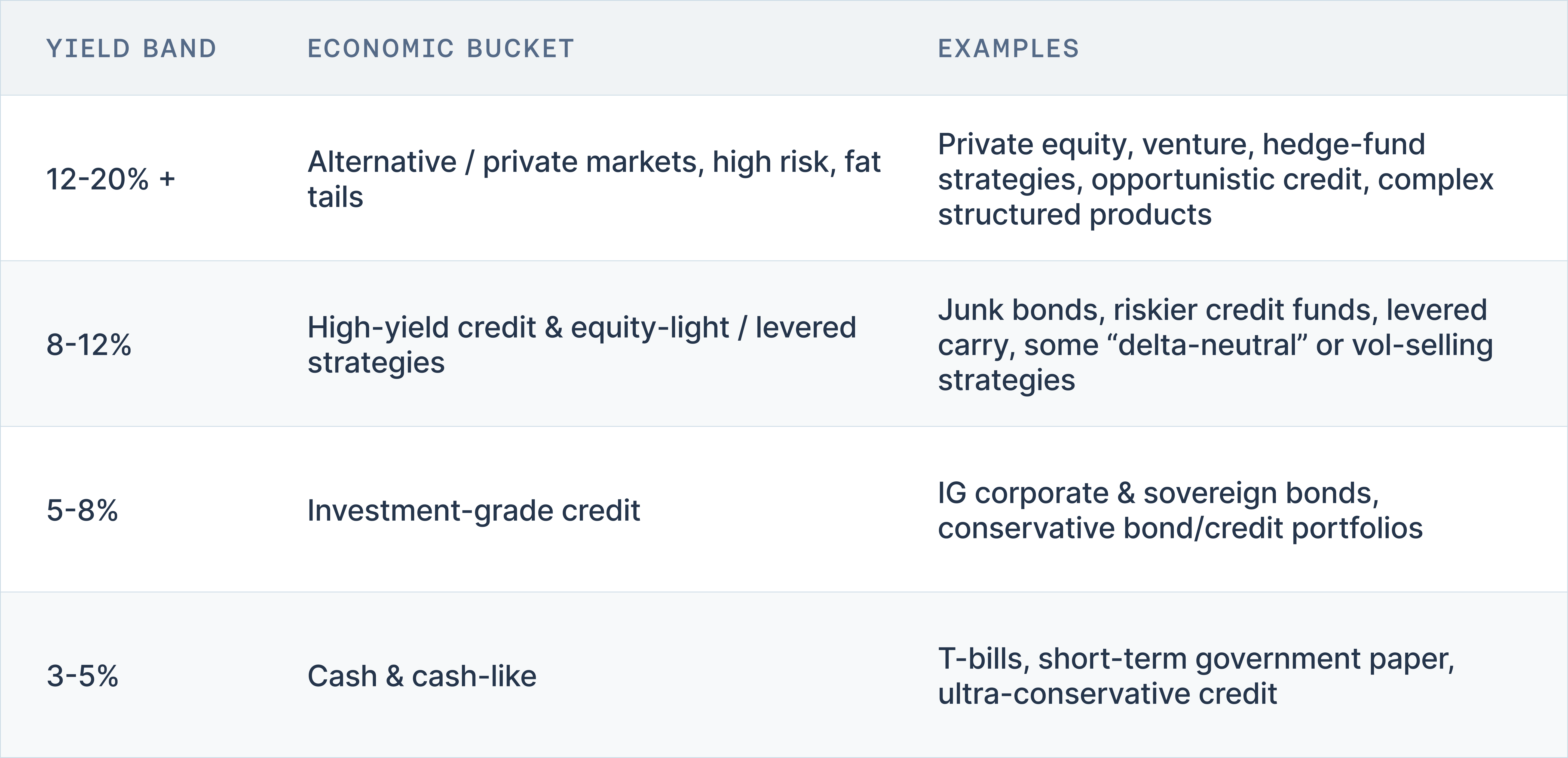 - 8-12% → High-yield bonds, riskier credit, equity-light strategies, some levered carry